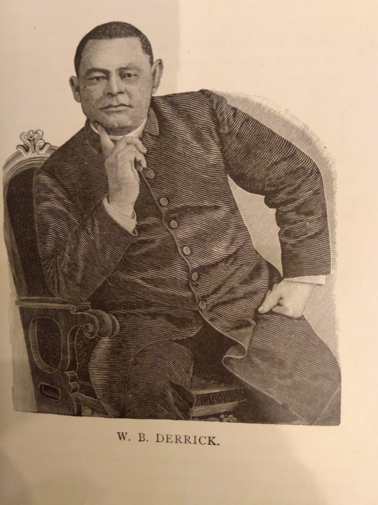 Many incidents transpired while he remained on board his floating home, many of which beggar description, as, in the conflict between the Merrimac and Monitor, and in the heartrending scenes of carnage and blood. He was an American citizen now, and having been dismissed from the United States navy, took two steps, one in leading the altar of matrimony Miss Mary E. White, the only daughter of Edwin White, Esq., of Norfolk, Virginia, and the other to take the initiatory to enter the ministry of the African M.E. Church by joining the church at Washington, District of Columbia, under the pastoral care of Rev., [now] Bishop J.M. Brown, who, after the usual preliminaries, licensed him to preach and at the same time to act as missionary agent, both of which offices he held until 1867. He was then admitted to the regular traveling connection, appointed by the Rt. Rev. D. A. Payne, D. D., LL. D., to Mt. Pisgah chapel, Washington, District of Columbia, where he labored for one year as preacher and teacher. In the year 1868 he was ordained deacon, and transferred to the Virginia conference, which closed before he arrived. His only alternative was to accept one of the most impoverished missions in the district, situated in the Alleghany mountains, almost on the border of the Tennessee line. At the annual conference at Portsmouth, he was elected elder and was ordained by Bishop J. P. Campbell, D. D., LL. D., after which he was appointed pastor and presiding elder of the Staunton church and district. From this time he may be said to be firmly established in the Christian ministry. He was reappointed presiding elder, pastor and conference secretary at the annual conference held in Norfolk in 1870; Staunton, 1871; Richmond, 1872; Portsmouth, 1873; Danville, 1874; Richmond, 1875; Portsmouth, 1876; Wytheville, 1877; Farmville, 1878; and Hampton, 1879; as a delegate to the general conference held in Nashville, 1872, at Atlanta, Georgia, 1876, and at Baltimore, Maryland, 1884, serving on all important committees in the sessions. In politics he has taken an active part. In Virginia, when the question of readjusting the State was agitating the country, and was submitted to the people to be voted upon in the November elections of 1879, he took sides with the party that was in favor of paying the debt as had been contracted. This party was known as the “Funders.” His attitude was in perfect harmony with the platform of the National Republican party insomuch that the administration at Washington sanctioned his course again. As the colored people were considered dangerous and willing tools in the hands of ambitious men, who were unscrupulous and always ready to make use of them in furthering their own ends, regardless of consequences, he publicly denounced the faction known as “Readjusters,” who repudiated the payment of an honest debt. This controversy was considered the most vindictive political war ever waged in that section, and lasted several months, terminating in the triumph of the “Readjusters.” Mr. Derrick was disgusted, and knowing full well that as leader of the opposite faction he would have to suffer, he resigned his charge, left the South again, and took a trip to the West Indies in company with his wife. In this tour he traveled in the Bermudas, Jamaica, St. Thomas and Antigua, his native land. After twenty years absence he first visited the home of his oldest sister; then the graves of his departed parents and other members of the family. He preached and lectured to almost all the churches, on popular subjects. Returning to the United States, he resumed his ministerial duties. He has since served churches in Salem, New Jersey; Albany, New York, and Sullivan Street church, New York City, where he continues to enjoy the confidence of the members of his church and the community at large.